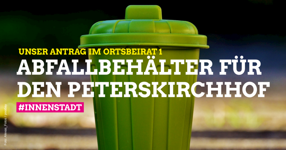 Der Magistrat wird aufgefordert, Abfallbehälter in ausreichender Größe und Anzahl mit vogelsicherer Überdeckelung, Pfand-flaschenhaltern und Aschern im Peterskirchhof neben den Bänken aufzustellen, um die zunehmende Vermüllung in den Griff zu bekommen. Des Weiteren soll die Frequenz der Leerung erhöht werden. Falls die vorgenannte Lösung aus Denkmal-schutzgründen nicht möglich ist, sollen für die Dauer der Coronapandemie temporär Abfalltonnen aufgestellt werden.