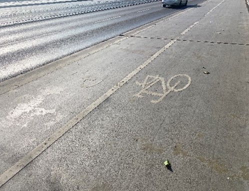Zur weiteren Verwirrung tragen zudem die ausgeblichenen Piktogramme auf dem Boden bei. Diese stellen zwar gemäß StVO keine Verkehrszeichen dar, jedoch richten sich die meisten Verkehrsteilnehmenden nach diesen Zeichen. Es kommt erschwerend hinzu, dass die Piktogramme auf der gesamten Länge der Brücke farblich auf dem hellen Beton schwer erkennbar sind.