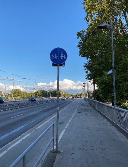 Die Beschilderung auf der Westseite der Friedensbrücke ist widersprüchlich. Von Norden besteht ein „Getrennter Rad- und Gehweg“, von Süden ein „Gehweg“ mit Zusatzzeichen „Radverkehr frei“.