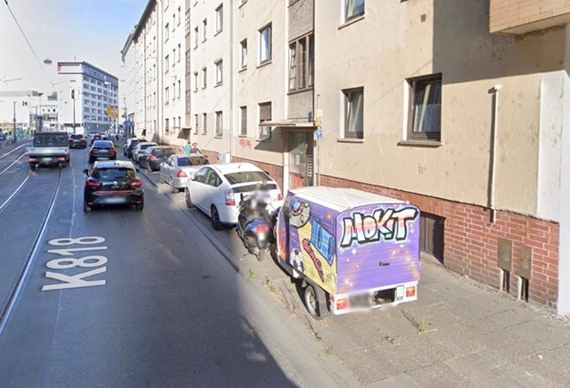 Fahrzeuge parken auf dem beschilderten Parkstreifen auf dem Gehweg und schränken die Gehwegbreite so stark ein, dass ein Durchkommen für Fußgehende in vielen Fällen nicht möglich ist.