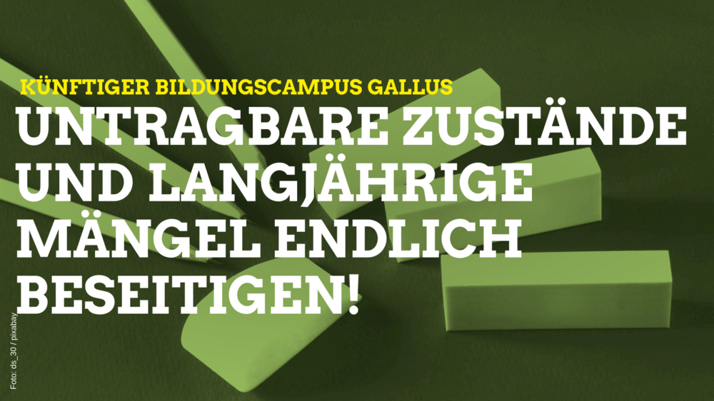 Der seit 2017 geplante Bau des Bildungscampus Gallus ist ins Stocken geraten. Gerade erst wurde das Interessenbekundungsverfahren zur Vorbereitung des Architektenwettbewerbs von der Stadt gestartet. Unter Berücksichtigung realistischer Planungs- und Bauzeiträume müssen die Gebäude also noch mehrere Jahre nutzbar bleiben.