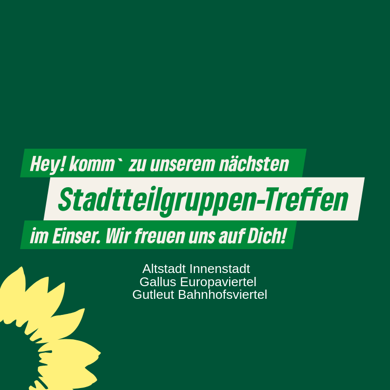 Unser nächstes Stadtteilgruppentreffen findet am Montag, den 28.7. um 19 Uhr im Saalbau Gallus statt (Wilhelm Derlam-Raum). Auf dem Programm steht Folgendes: