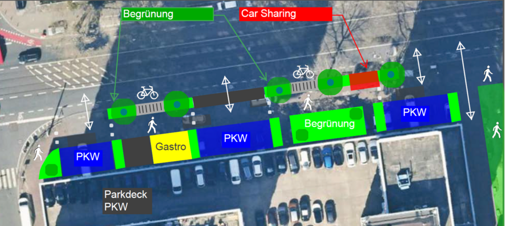 Zusätzlich sollte im Sinne der notwendigen Entsiegelung und Begrünung dafür gesorgt werden, dass einzelne Flächen und Stellplätze entsiegelt werden und die ursprünglich genehmigten Pflanzbeete auch errichtet werden. Das würde wiederum für weniger Parksuchverkehr vor Ort sorgen. Im Zuge der Umgestaltung sollen erstmals Abstellmöglichkeiten für Fahrräder für die Kund*innen geschaffen werden. Eine Car-Sharing-Station kompensiert die entfallenden PKW-Stellplätze.#