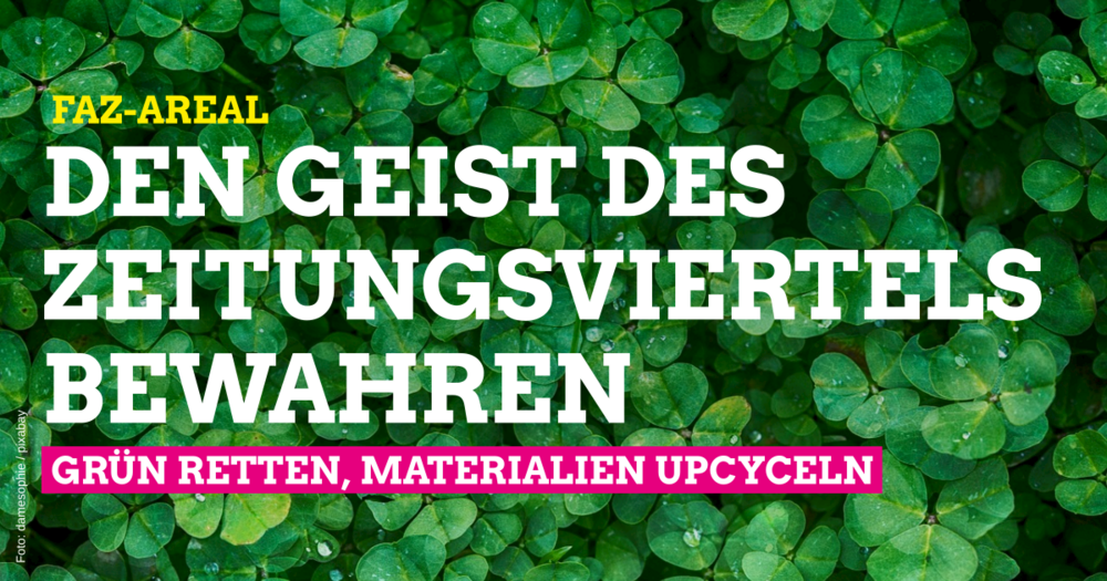 Der Magistrat wird beauftragt, im Rahmen der Neubebauung des FAZ-Areals zu berücksichtigen, dass die Ziegel der Bestandsfassade sowie weitere Materialien in größtmöglicher Weise wiederverwendet werden und damit einen Bezug zur bislang quartiersprägenden Fassade herstellen bzw. an die Zeitungstradition im Gallus erinnern. Gleichzeitig sollen Bäume, Sträucher und Pflanzen aus dem Bestand so weit wie möglich erhalten und in die Neuplanungen einbezogen werden.
