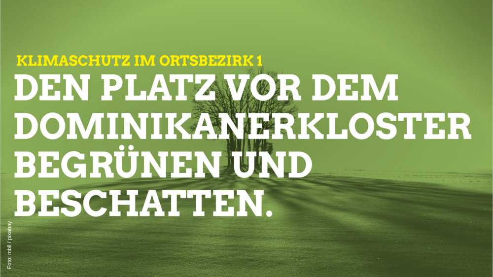 Der Magistrat wird aufgefordert, den Bereich westlich des Dominikanerklosters zwischen Heiliggeistkirche und Straßenbahnhaltestelle zu begrünen und mit weiteren Schatten spendenen Bäumen bepflanzen zu lassen. Selbstverständlich ist auf eine durchdachte und funktionale Durchwegung dieses Bereichs zu achten.
