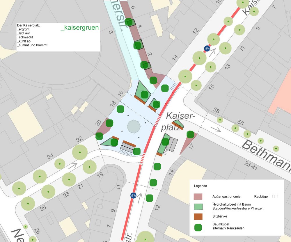 Der Magistrat wird gebeten, ein Konzept zur Stadtmöblierung für den Kaiserplatz zwischen der Kaiserstraße und Kirchnerstraße mit Beteiligung des Ortsbeirates 1 erarbeiten zu lassen mit folgenden Schwerpunkten: