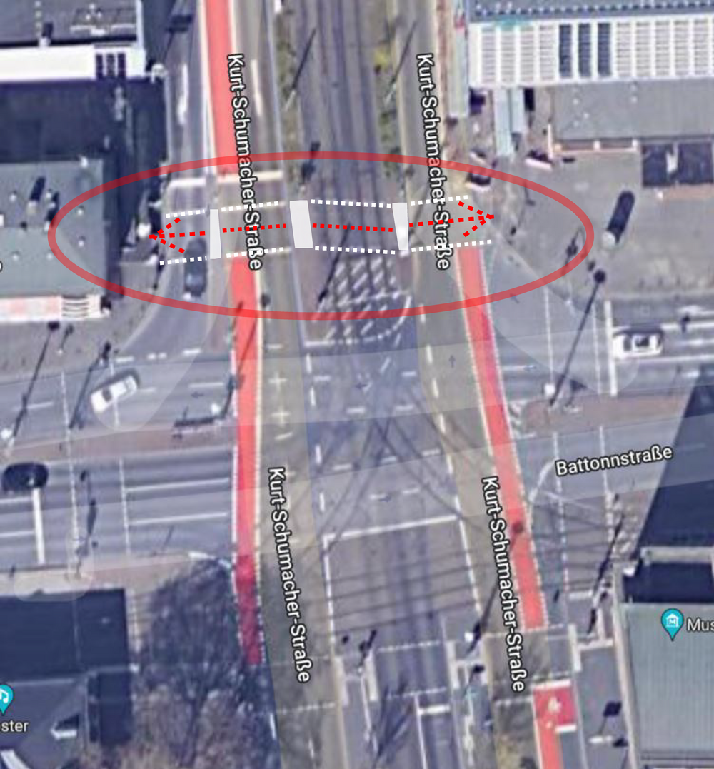 Die Ampelschaltung der sehr stark befahrenen Kreuzung ist auf den PKW-Verkehr und ÖPNV ausgerichtet. Auf Fußgehende hat man keine Rücksicht genommen. Möchten Fußgehende den Überweg nutzen, müssen sie mindestens zwei, bei einer nahenden Straßenbahn oder einem Bus gar drei Grünphasen abwarten. Erschwerend kommt hinzu, dass die dazwischen liegenden Gehwegbereiche extrem schmal sind, so dass Eltern mit Kinderwagen oder mobilitätseingeschränkte Menschen kaum Platz haben. Das ist gefährlich und behindert den Fußverkehr massiv.