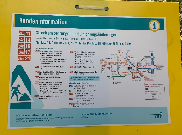 Wann immer gerade zu Ferienzeiten baustellenbedingt Streckenführungen von öffentlichen Verkehrsmitteln geändert werden, entsteht Konfusion. Plötzlich fahren Straßenbahnen auf ungewohnten Wegen, wie jetzt gerade während der Herbstferien die Linien 16 und 17, die plötzlich im Gallus verkehren. Dafür werden bekannte Linien wie 14 und 21 eingestellt. Das Problem dabei sind die Kundeninformationen, die man an den Haltestellen findet, wenn man Glück hat. Selbst ortskundige Verkehrsteilnehmende kommen darüber ins Grübeln. Wie sollen sich erst Ortsfremde anhand dieser Graphiken und Beschreibungen orientieren?