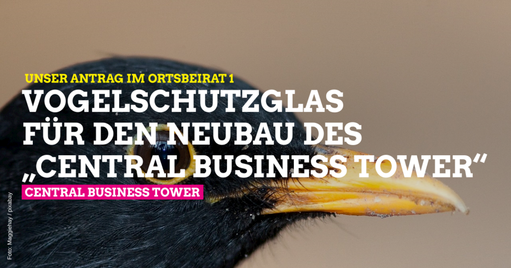 Der Magistrat wird aufgefordert, dafür Sorge zu tragen, dass im Rahmen des vorhabenbezogenen Bebauungsplans zum Neubau des „Central Business Tower“ der HeLaBa sogenanntes Vogelschutzglas zum Einsatz kommt.