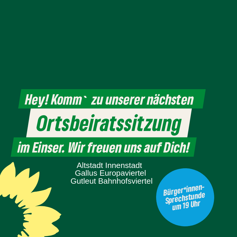 Unser monatliches Treffen für alle Mitglieder und Interessent:innen im Ortsbezirk 1 (Innenstadt, Altstadt, Bahnhofsviertel, Gallus, Gutleut, Euroaviertel)