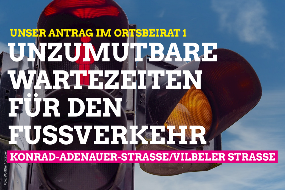 Der Magistrat wird aufgefordert, die unzumutbar langen Wartezeiten an der Querungshilfe Konrad-Adenauer-Straße, Vilbeler Straße (Querung der Konrad-Adenauer-Straße / Straßenbahn) deutlich verkürzen zu lassen.