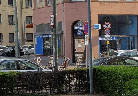 Wesentlich größere und auf den fließenden Verkehr ausgerichtete Tempo-30-Schilder in der Allerheiligenstraße im Bereich der Liegenschaften Battonnstraße 1-3 sowie auf der gegenüberliegenden Straßenseite.